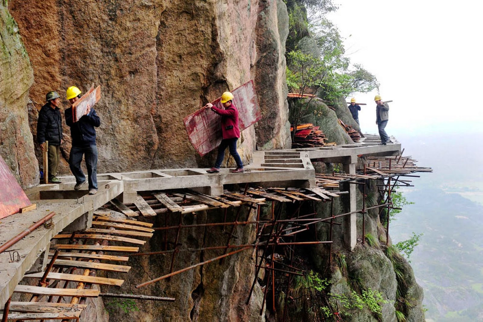Постройка дороги на горе Шифу осложняется тем, что гора поднимается вертикально под углом 90 градусов, в ней нет никаких выемок или ниш.